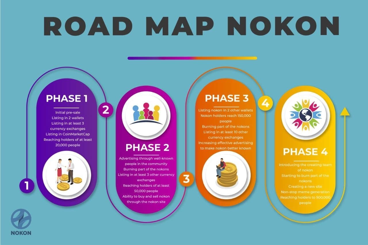 در سایت نوکون رود مپ آن قرار داده شده است. تیم نوکون در فاز اول قصد دارند نوکون را در دو کیف پول لیست کنند و همچین قصد دارند در 3 صرافی  متمرکز و غیرمتمرکز نوکون را لیست کنند تا امکان خرید و فروش برای همه فراهم و آسان باشد.